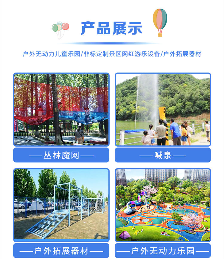 主营:户外无动力儿童乐园,非标定制景区网红游乐设备,户外拓展器材